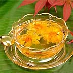 菊花不仅看起来赏心悦目,采摘下来后还可制成保健茶。菊花茶有清热解毒,清肝明目的功效,对口干、火旺、目涩,或由风、寒、湿引起的肢体疼痛、麻木等疾病均有一定疗效。泡饮菊花茶时,最好用透明的玻璃杯,每次放上四五粒,再用沸水冲泡即可。若是饮用的人多,可用透明的茶壶,每次放一小把,冲入沸水泡 2—3分钟,再把茶水倒入数个玻璃杯中即可。如果加少许蜂蜜,口感会更好。