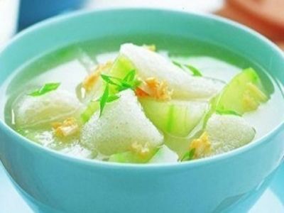 用料:冬瓜500克,鸡汤750克,冬菇2只,鸡胸肉50克,火腿20克,鲜虾50克,瘦猪肉30克。
