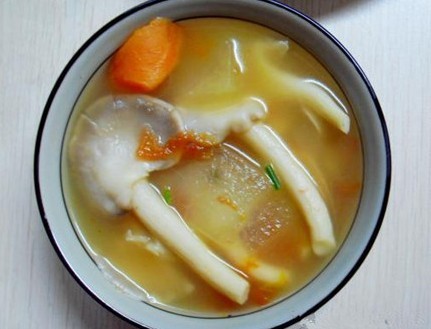 蘑菇冬瓜汤:将蘑菇去蒂洗净切薄片,冬瓜去皮切片;汤锅中放入素高汤500毫升烧沸,然后放入冬瓜和葱花姜末,烧滚后加入蘑菇,煮熟后用盐、香油调味即可。