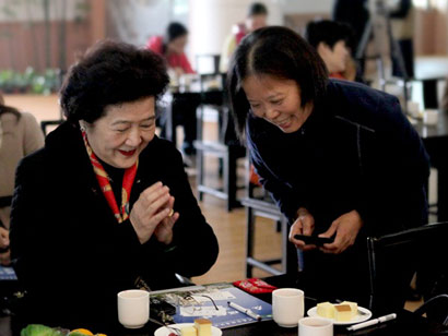 民众在志工引导下,来到了健康促进中心的一楼就座,每张茶座上都摆着精致的点心与水果,志工们还不停的为大家添加茶水,场面充满着温馨。
