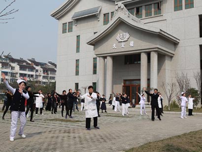 在户外,志工带动歌曲来舒活筋骨。(图片来源:慈济基金会 摄影:陈一燕)