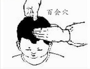 将手指指端按压在百会穴(两耳尖在头顶连线的中点)点按揉动,动作轻缓,用力不宜过大,反复2~3分钟。