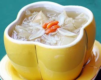 做法:将干银耳20克浸泡,摘去蒂梗,洗净,蒸30分钟;鲜百合100克去蒂洗净,香蕉2根去皮切片;将以上食材同放炖盅内,加枸杞、冰糖、水适量蒸30分钟即可。