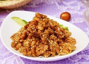 制作:将核桃肉放入开水中,加少量精盐浸泡10分钟,挑去核桃皮衣,洗净,沥干。锅内放少量清水及白糖,熬至糖汁浓稠,投入核桃肉拌炒,使糖汁裹包在核桃肉上。换锅将香油加热,投入粘满糖汁的核桃肉,用文火炸至金黄色,捞出,沥去油,晾凉后食用。