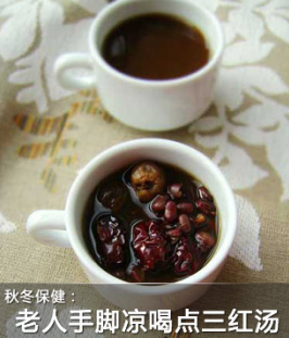 天气转冷,很多老年朋友手脚冰凉的毛病又犯了,推荐一款由红豆、红糖和红枣煮成的三红汤,可提高身体耐寒能力。