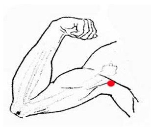 极泉穴位置在腋下。一手托起心悸者的左侧上肢,找到位于腋窝顶点的极泉穴(腋窝正中,腋动脉搏动处),在穴位附近找到条索状物。然后,用食指一前一后地来回弹拨条索状物,或食、中指并拢,伸入腋窝内,用力弹拨位于腋窝顶点的极泉穴,弹拨时患者会有全手电麻感,直至症状缓解。