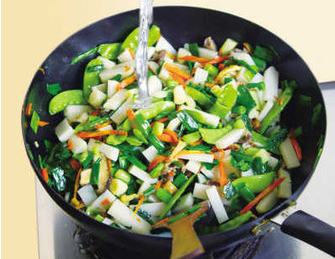 炒青菜最好不加水。炒青菜时,中途最好不要加水,直接把切好的菜放在锅里烹炒,用自身的水分来做热传递,这样做的菜才好吃。如果中途确实要加水,不应该选择凉水,因为加入凉水后,锅内的温度会突然下降,使青菜在锅里烹炒的时间延长,会让菜变老变硬,口感变差。这种情况下,应该加少量开水,这样不至于过多影响烹调温度,炒出来的青菜会相对脆嫩一些。此外,无论炖肉,还是煲汤,中途加水时应该首选热水。