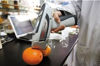 实验过程:检测人员拿出手持式X光能谱仪,直接对准橙子染色的表皮,测试重金属成分。随后将该橙子对半切开,露出果肉,再用手持式X光能谱仪测试果肉里是否有重金属。