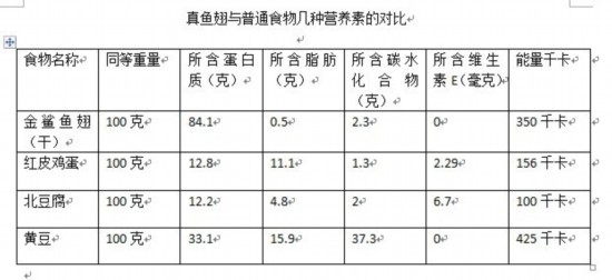 有人说鱼翅的营养价值很高,尤其是蛋白质高,可是在普通的食物中富含高蛋白质的也不少,先来看一份食物营养成分表里的数据: