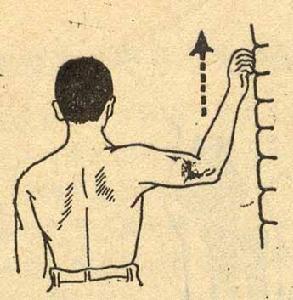 1、正(侧)身单手爬墙:正(侧)面向墙壁站立,用痛的一侧的手指沿墙缓缓向上爬动,使上肢尽量高举,到最大限度,在墙上作一记号,然后再徐徐向下回到原处,反复进行,逐渐增加高度。