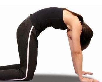 3. 呼气,低下头的同时,腹部往后收缩,此时腰部朝天花板呈拱形拉伸;