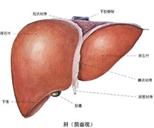 人的肝脏位于右季肋部及上腹部,上部紧贴膈肌,与右肺和心脏相邻;下面与胃、十二指肠,结肠右曲相邻;后面接触右肾、肾上腺和食管喷门部,是人体最大腺体,红褐色,质软而脆,呈楔形,右端圆钝,左端扁薄,可分为上、下两面,前后两缘,左右两叶,一般重