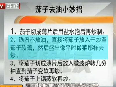 专家建议:吃茄子不一定要过油;做茄子加淀粉可以减少油的摄入;用盐腌茄子既可以防止氧化又可脱水;烧茄子少放油,蒜和香油来提味。