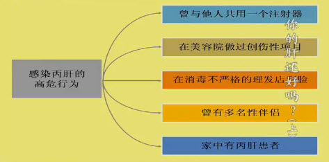感染丙肝的高危行为:与他人公用乙肝注射器、在美容院做过创伤性项目、在消毒不严格的理发店刮脸、曾有多名性伴侣、家中有丙肝患者。