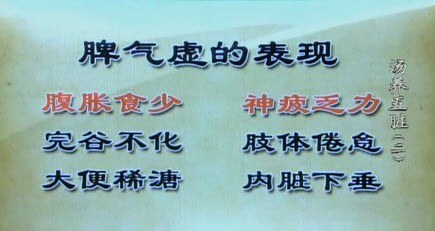 脾气虚的表现:腹胀食少,神疲乏力,完谷不化,肢体倦怠,大便稀溏,内脏下垂。