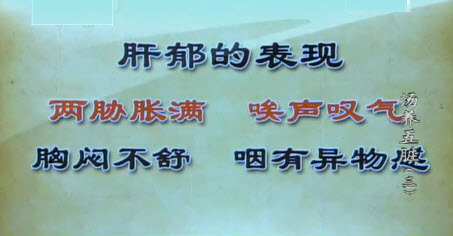 肝郁的表现:两肋胀痛,唉声叹气,胸闷不舒,咽有异物感。
