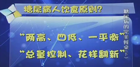 糖尿病人的饮食原则是两高、四低、一平衡;总量控制、花样翻新。
