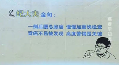 节目请到的嘉宾是纪小龙。主题是《癌症早知道(五)》。主要介绍肾癌的早期症状,肾癌的排查方法,肾囊肿和肾癌的关系,膀胱癌的早期症状,膀胱癌的治愈,前列腺增生和前列腺癌的关系,前列腺癌的检查方法等相关内容