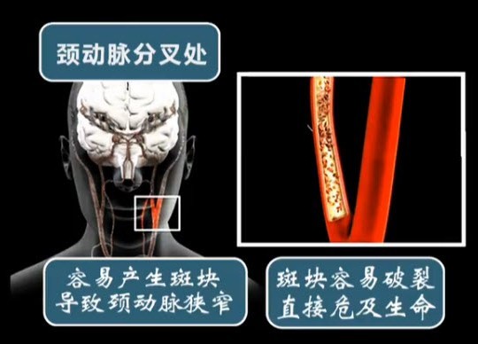 颈动脉分叉部位很容易形成斑块,斑块导致血管狭窄,血液供应不足。