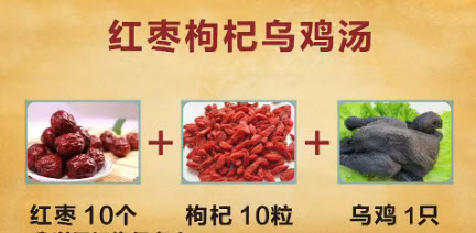 红枣有补气补血的功效;枸杞滋补肝肾之阴;乌鸡补血补虚;桂圆大补气血。