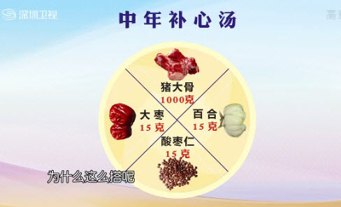 中年补心汤:猪大骨滋阴润燥;大枣补气补血;百合清新热、养心阴、安心神;酸枣仁养心护肝安心神。