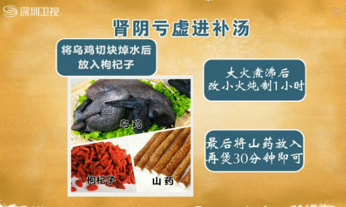 肾阴亏虚进补汤:乌鸡、枸杞、山药。