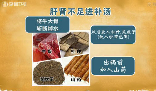 肝肾不足进补汤:牛骨、杜仲、菟丝子、山药。
