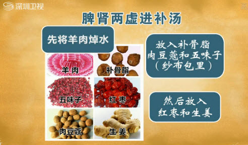 脾肾两虚进补汤:羊肉、五味子、补骨脂、红枣、肉豆蔻、生姜。