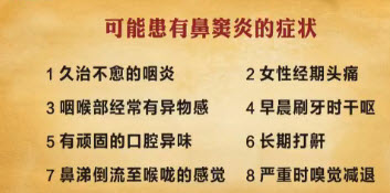 咽喉炎、打呼噜、经常性头痛、胃炎、哮喘、支气管扩张、鼻炎、中耳炎、眼睛有血丝。如果有那么您可能患上了鼻窦炎。