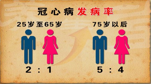 在25至65岁之间,男性的冠心病发病率约为女性的两倍,65岁以后,这种比率逐渐减小,75岁以后,男女冠心病的发生比率约为5:4。男性的生活习惯差、脾气大、男女的激素差异和脂肪分布差异是造成冠心病“重男轻女”的主要原因。
