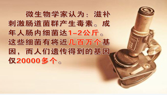 上海有个调查,九成以上受访者会送老人补品,但很多人因吃补品出现上火症状。其深层次原因,微生物学家认为:不当进补可刺激肠道菌群产生毒素。成年人肠道内的细菌达到1到2公斤。细菌非常小,但数量大了体积也是惊人的,这些细菌含将近几百万个基因,而人们遗传得到的基因仅20000多个,影响人生老病死更重要的是后天从环境里得到的细菌。